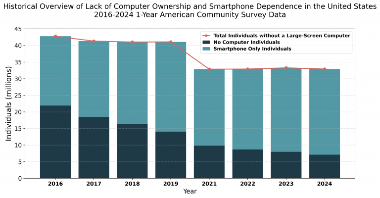 2024 American Community Survey (ACS) data reveal that more than 7.1 million people did not have access to a desktop or laptop computer, tablet, or smartphone. Another 25.8 million individuals relied solely on a smartphone to go online.