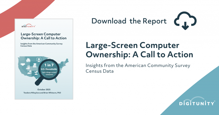 This report analyzes previously unpublished Census data on people who either have no computer at all or rely only on a smartphone for internet access. Together, these two groups make up Digitunity’s measure of “large-screen computer ownership.”